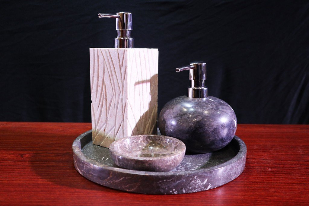 Terbuat dari Marbel stone, bahan-bahan ini dipilih karena keindahan tekstur dan warnanya yang alami. Dibuat oleh pengrajin lokal Indonesia menciptakan produk yang unik dan juga elegan dengan tetap memberikan kesan yang alami. Berfungsi bisa sebagai aksesoris di kamar mandi, baik sebagai pajangan ataupun digunakan sesuai kebutuhan mandi. Tempat sabun atau shampoo.