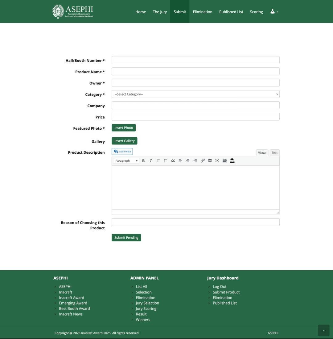 Setelah formulir Isian Pengiriman Produk berhasil terkirim, setiap peserta Independent atau peserta Mandiri wajib menyerahkan produk fisik nya langsung ke ruang Plenary Board 6 pada tanggal 05 Februari 2025 mulai dari pukul 10.00 WIB - 17.00 WIB. Peserta yang sudah mengirimkan produk secara online namun tidak menyerahkan produk nya sampai batas waktu yang ditentukan akan dianggap gugur dan produknya tidak diikutsertakan dalam penjurian. Produk dapat diambil kembali setelah selesai proses penjurian yaitu ditanggal 07 Februari 2025 dari pukul 10.00 WIB - 20.00 WIB dengan membawa bukti serah terima produk.